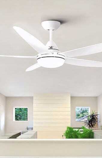 Energy-efficient DC motor ceiling fan installation, offering quieter operation and significantly reduced power consumption.
