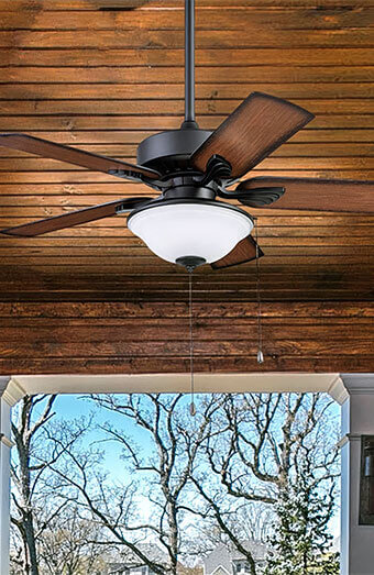 Weather-rated ceiling fan installation for patios, verandas, and covered outdoor areas, designed to withstand the elements.